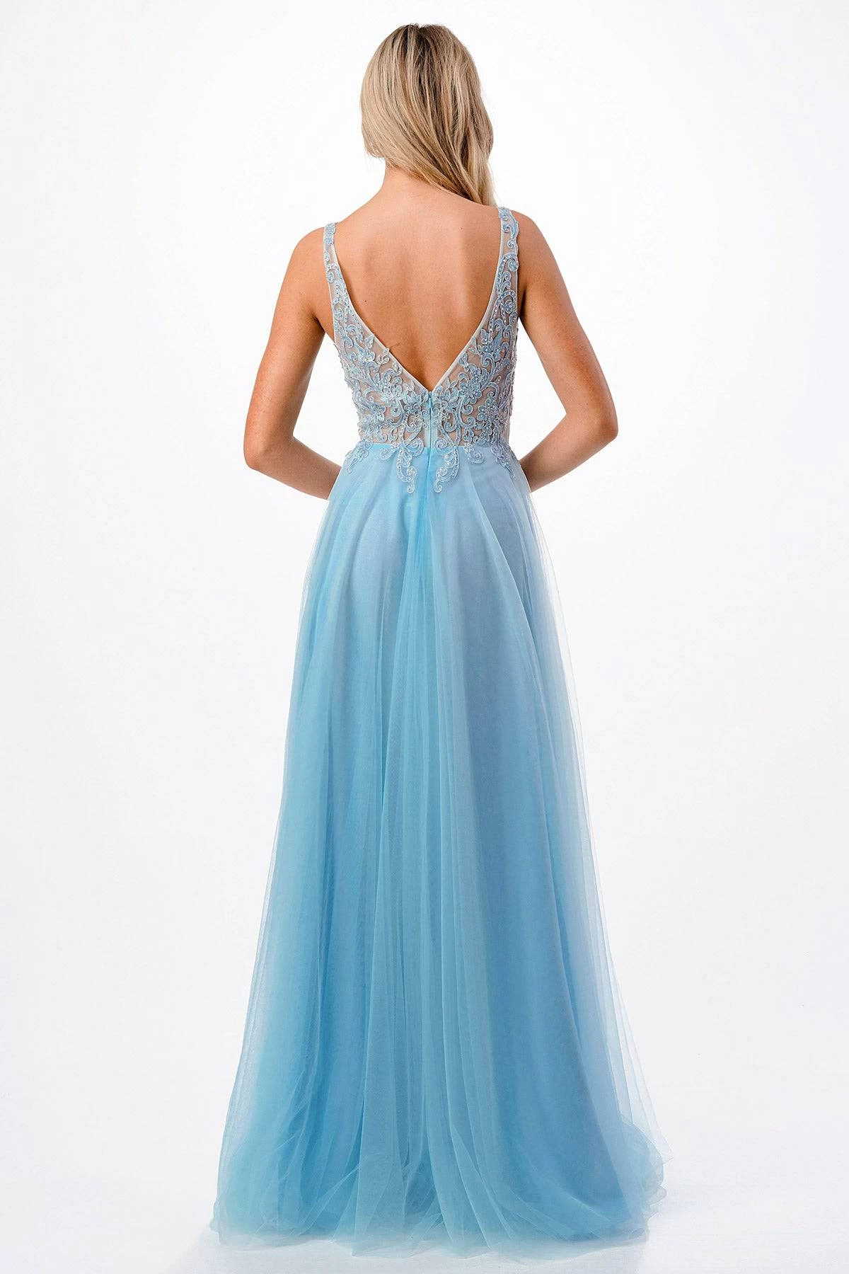 Aspeed P2108 Light Blue Sparkling V Neck Lace & Sheen Gown With Tulle Skirt