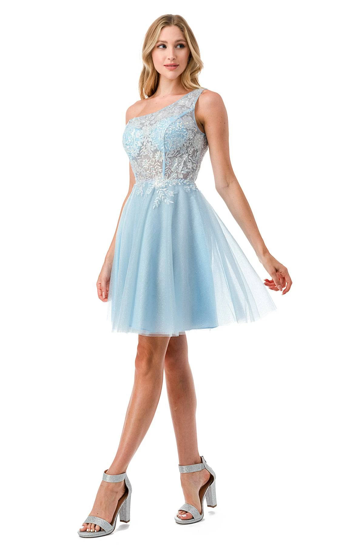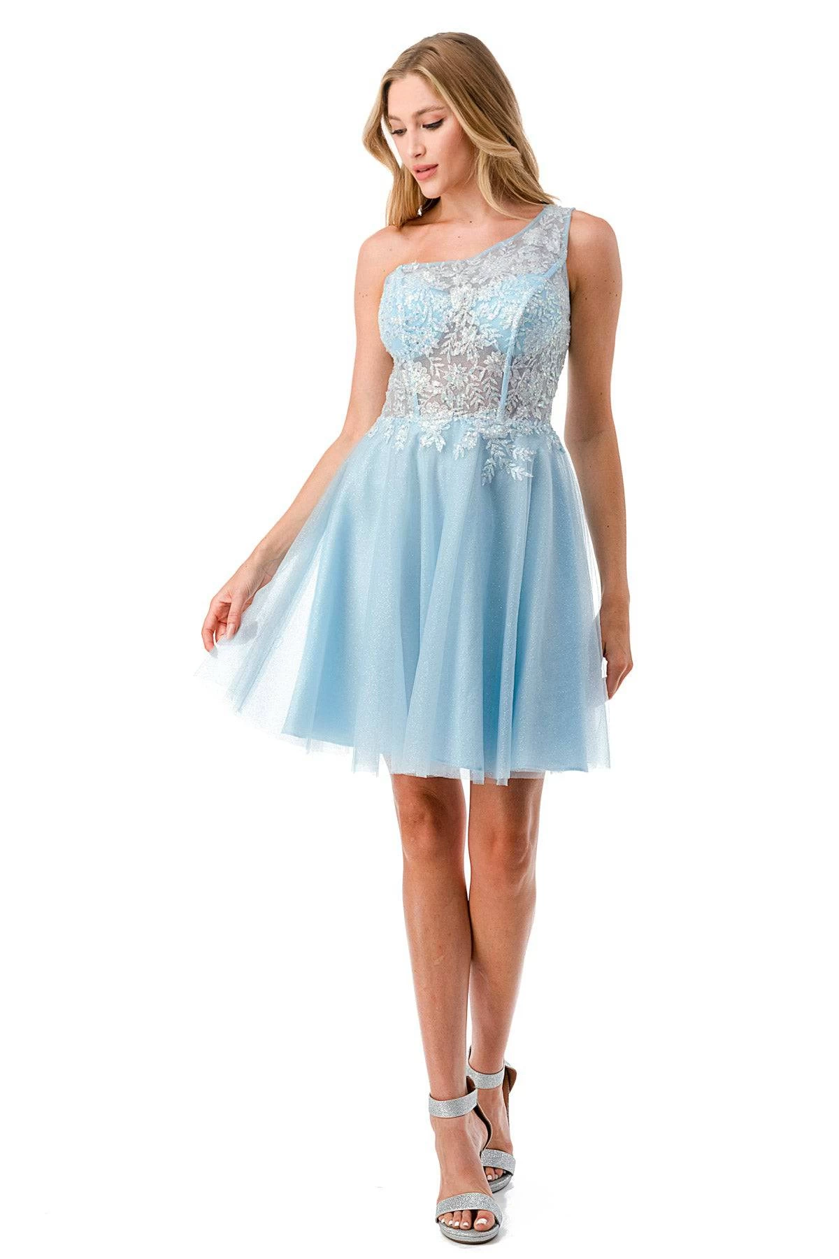 Aspeed S2723 Light Blue One Shoulder Lace & Sheer Short Dress