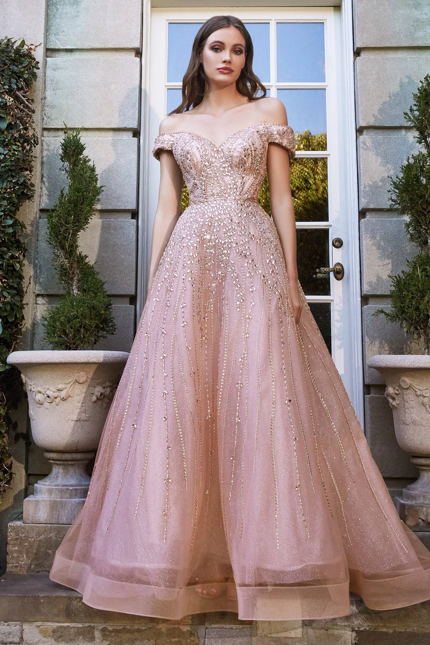 Cinderella Divine B715 Gorgeous Off Shoulder Rose Gold Ball Gown With Layered Skirt
