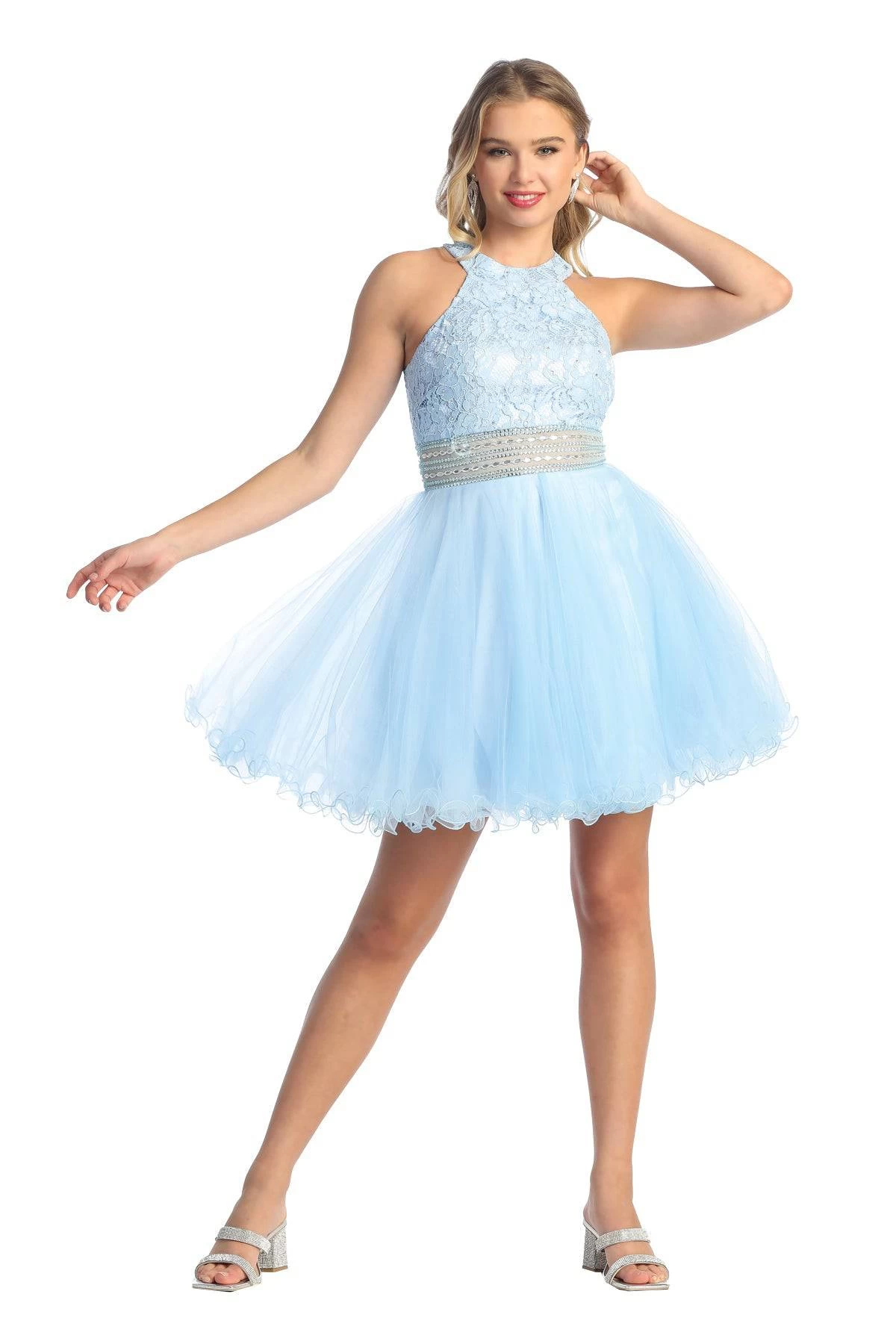 Cindy Collection 1447 Short Halter Dress features a gorgeous lace bodice, a tulle skirt and sparklingΒ stone belt!