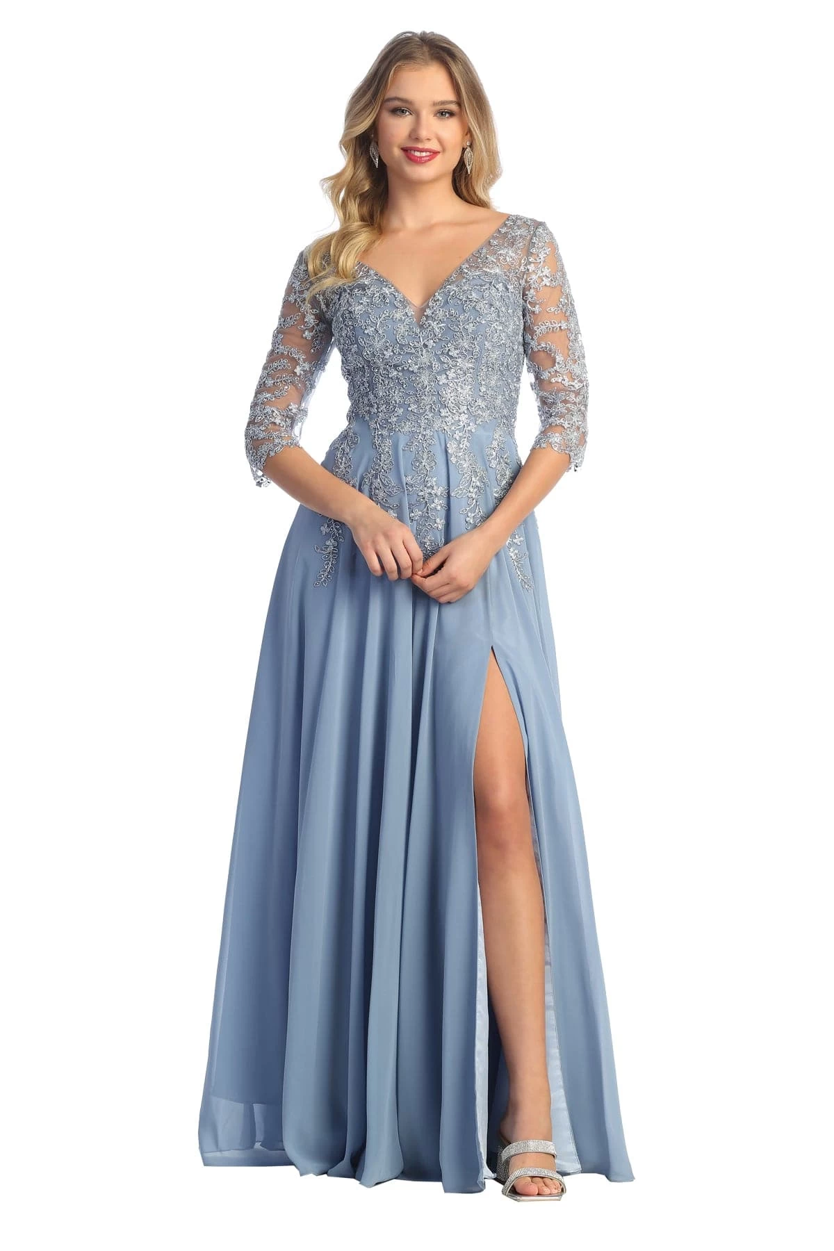 Cindy Collection 50441 3/4 Sleeve Ball Gown features stunning lace sleeves and a sexy leg slit!