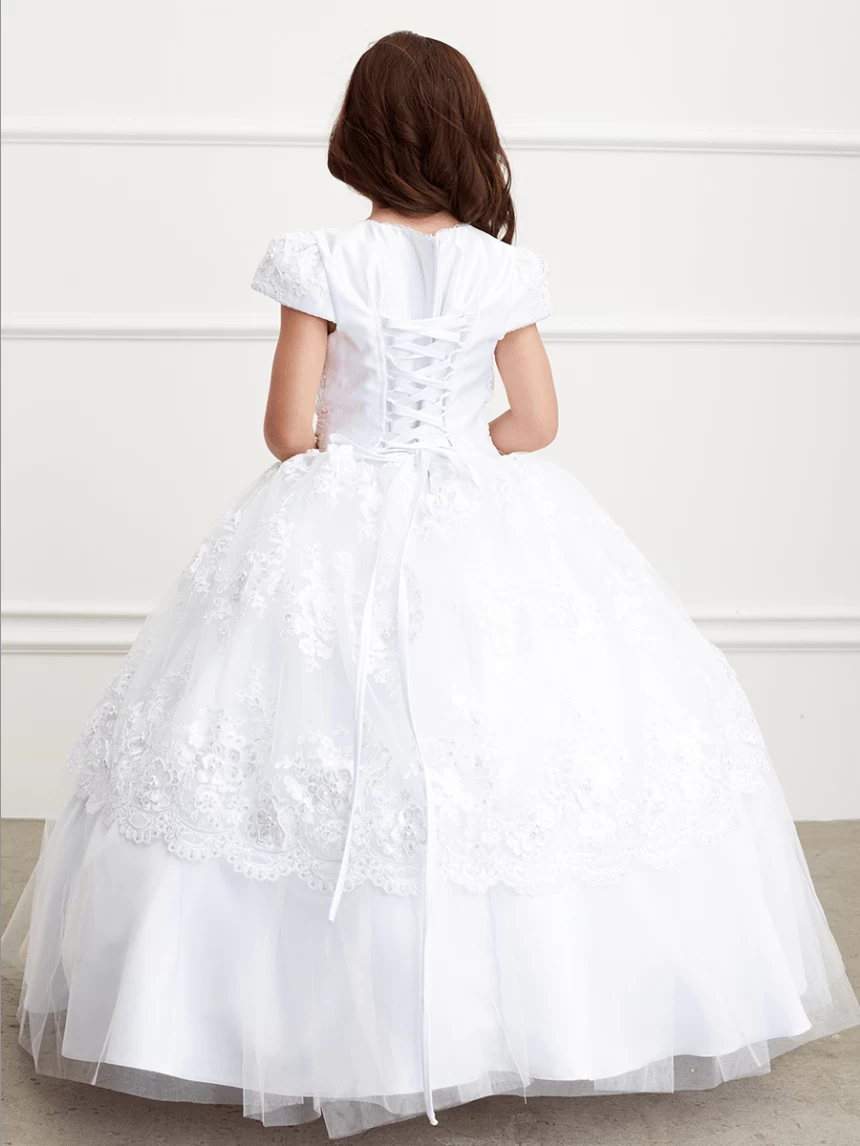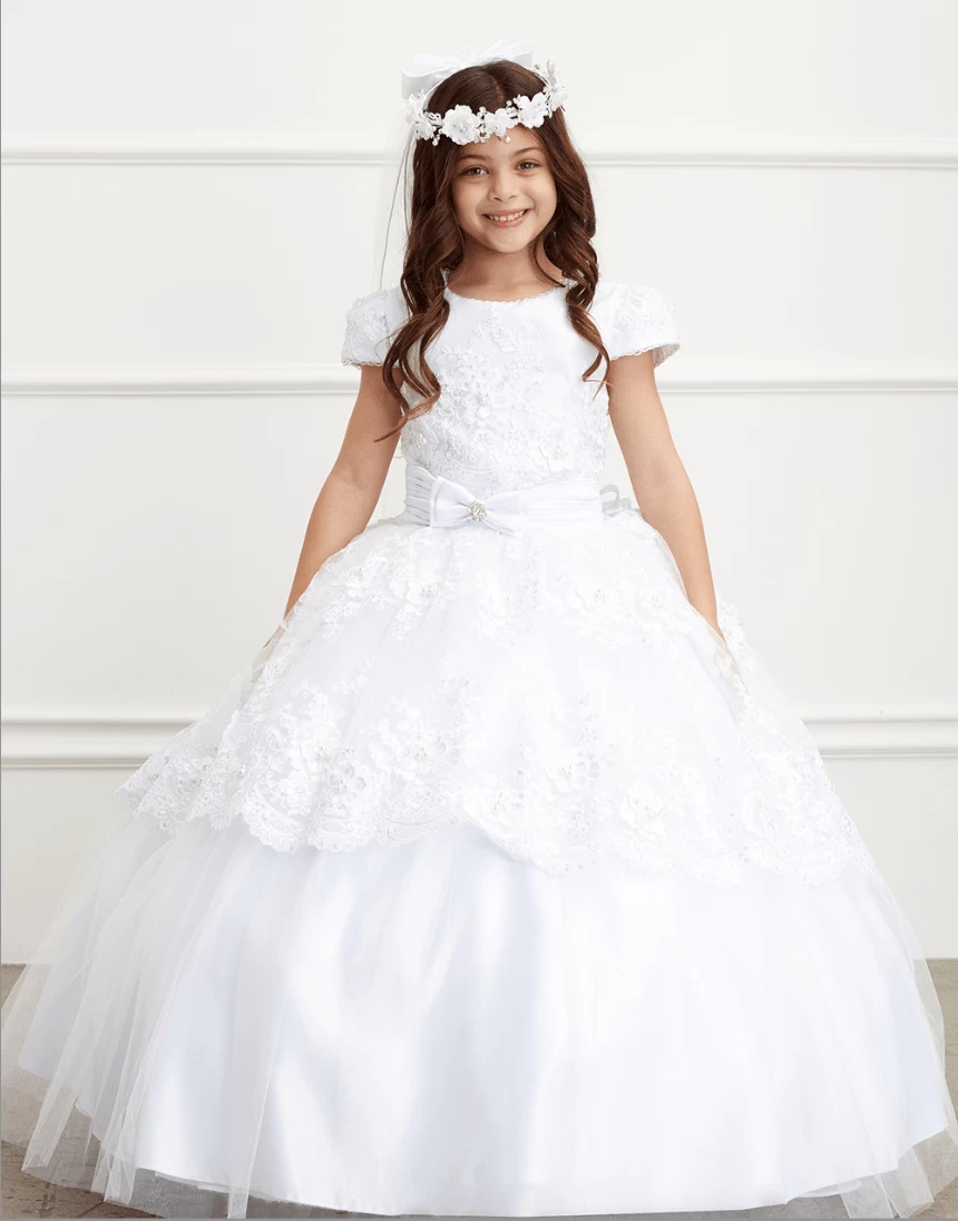 Sleeved Communion Lace Peplum Dress with Corset Back #TK1198 | Norma Reed